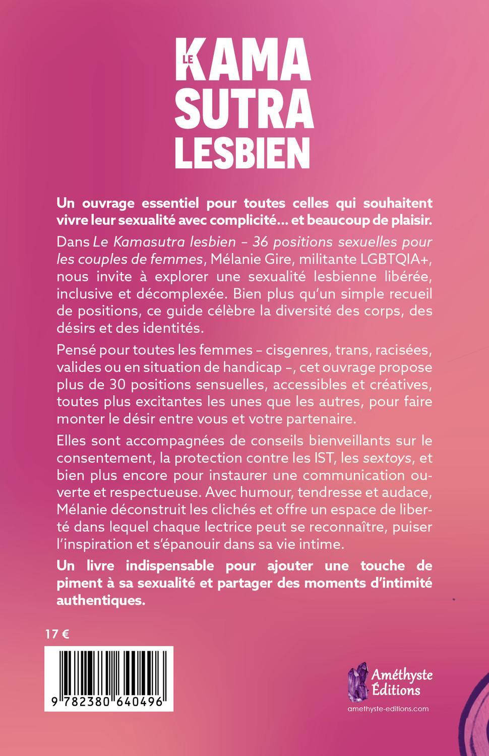 Un ouvrage essentiel pour toutes celles qui souhaitent vivre leur sexualité avec complicité… et beaucoup de plaisir. Dans Le Kamasutra lesbien – 36 positions sexuelles pour les couples de femmes, Mélanie Gire, militante LGBTQIA+, nous invite à explorer une sexualité lesbienne libérée, inclusive et décomplexée. Bien plus qu’un simple recueil de positions, ce guide célèbre la diversité des corps, des désirs et des identités. Pensé pour toutes les femmes – cisgenres, trans, racisées, valides ou en situation de handicap –, cet ouvrage propose 36 positions sensuelles, accessibles et créatives, toutes plus excitantes les unes que les autres, pour faire monter le désir entre vous et votre partenaire. Elles sont accompagnées de conseils bienveillants sur le consentement, la protection contre les IST, les sextoys, et bien plus encore pour instaurer une communication ouverte et respectueuse. Avec humour, tendresse et audace, Mélanie déconstruit les clichés et offre un espace de liberté dans lequel chaque lectrice peut se reconnaître, puiser l’inspiration et s’épanouir. Un livre indispensable pour ajouter une touche de piment à sa sexualité et partager des moments d'intimité authentiques.